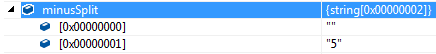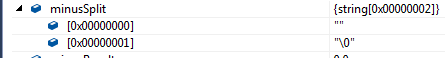 null하고 뭐가 다르지 싶어서 minusSplit[1]="\0"을 넣어보니 다음과 같이 값차이가 났습니다.