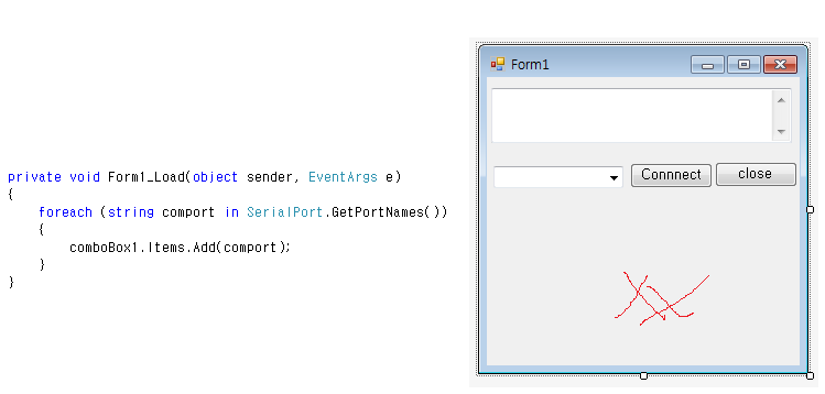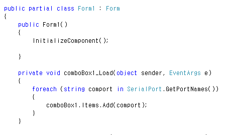 여기서 우리는 Form.Load단에서 접속가능한 시리얼 포트를 받아서 콤보박스 리스트에 추가할 것입니다.
